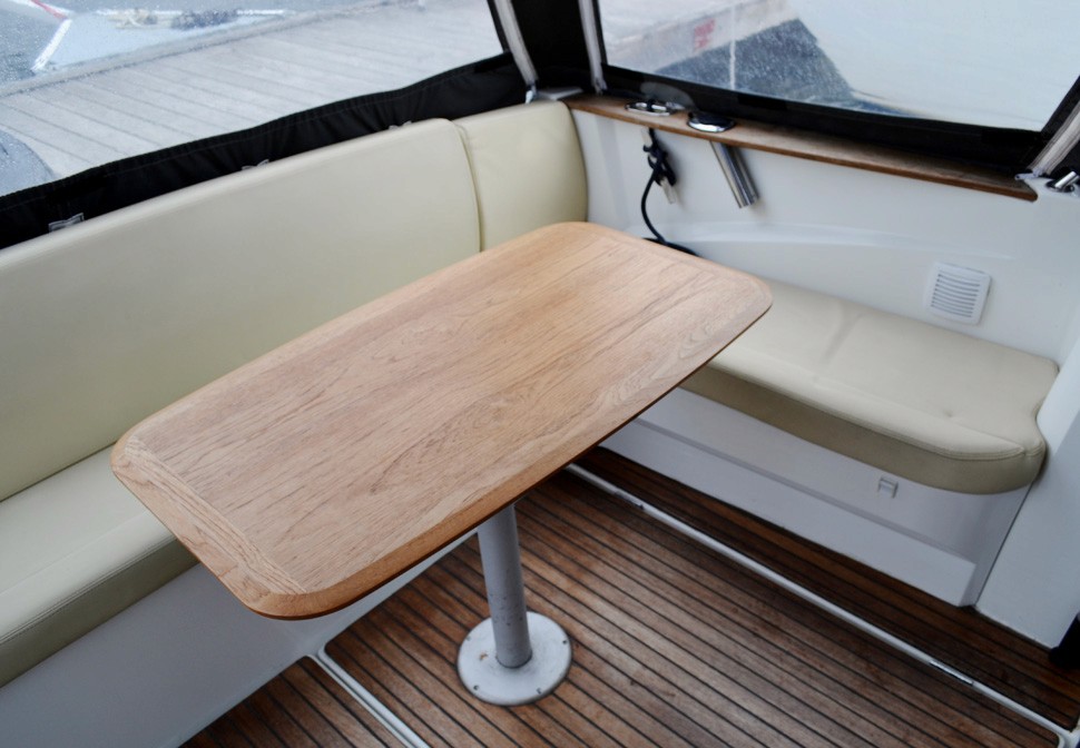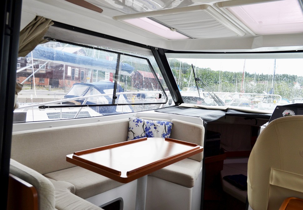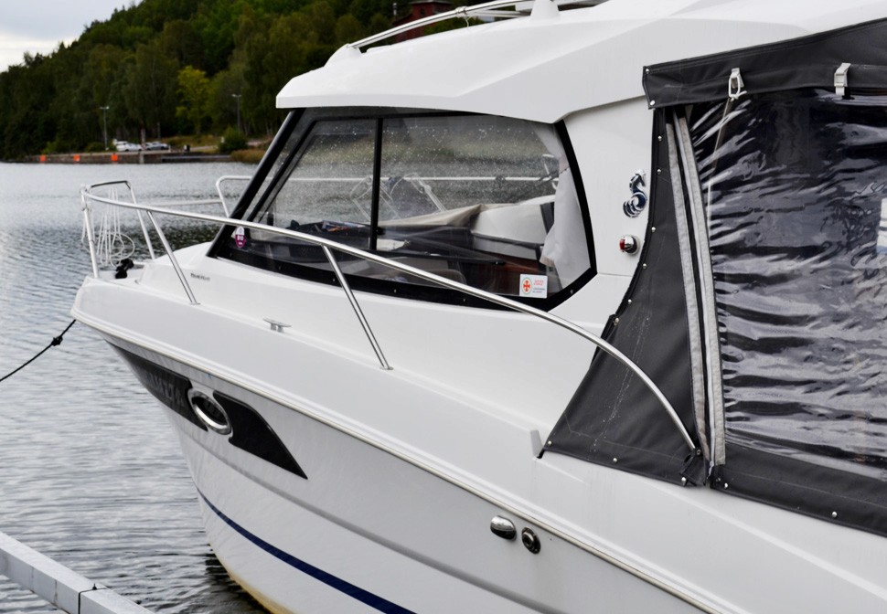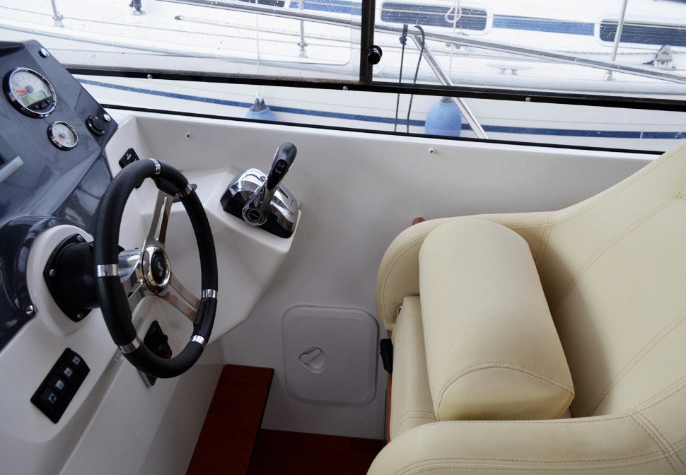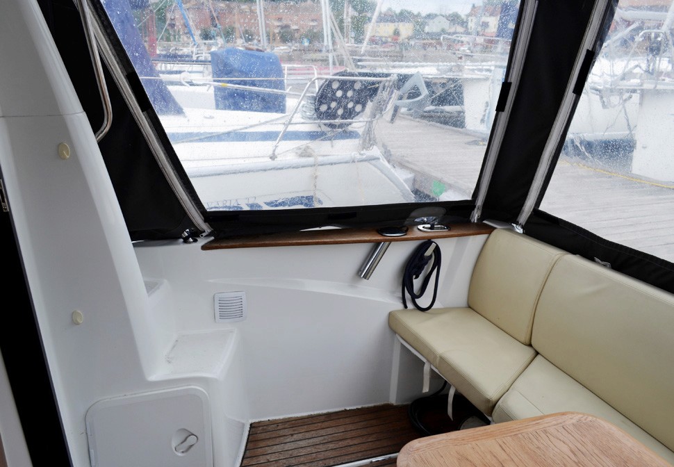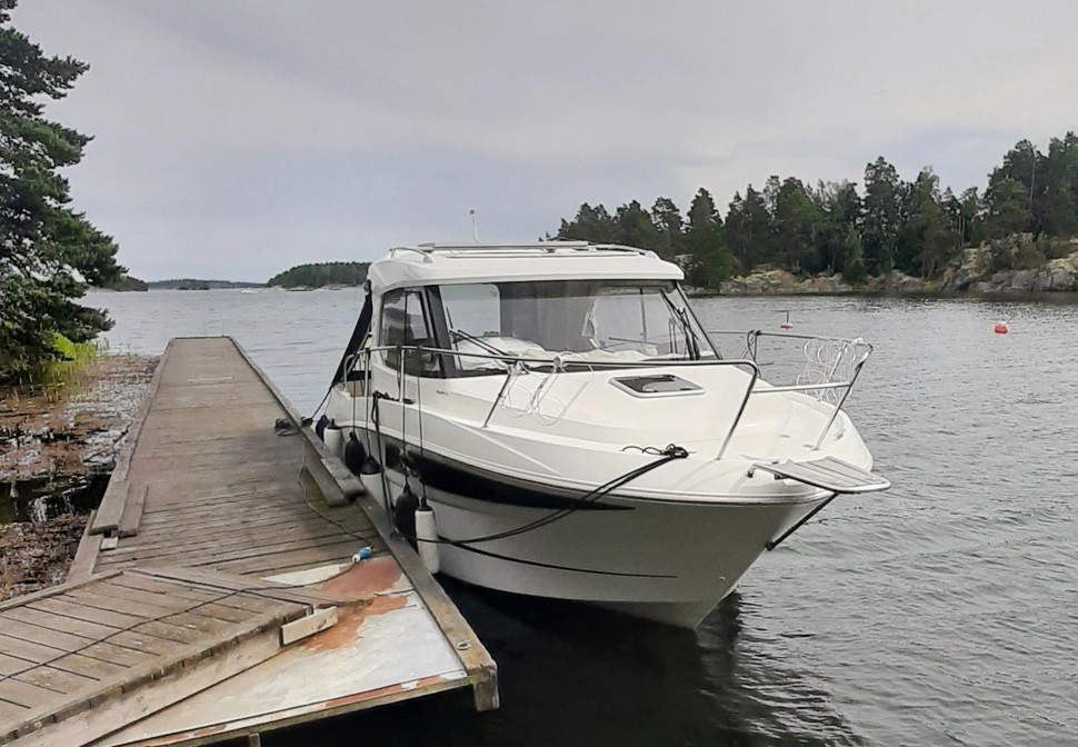 Båten är dessutom utrustad med plotter, kompass, solceller med regulator, batteriladdare, förbrukningsbatterier samt startbatteri, vindrutetorkare och vindrutespolning. Kapell, solskydd för rutor, peke, rostfria fenderhållare samt komplett förtöjningspaket ingår. Båtvagn medföljer.