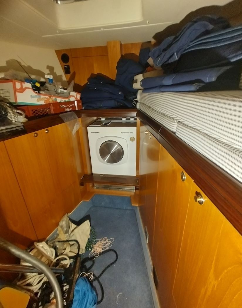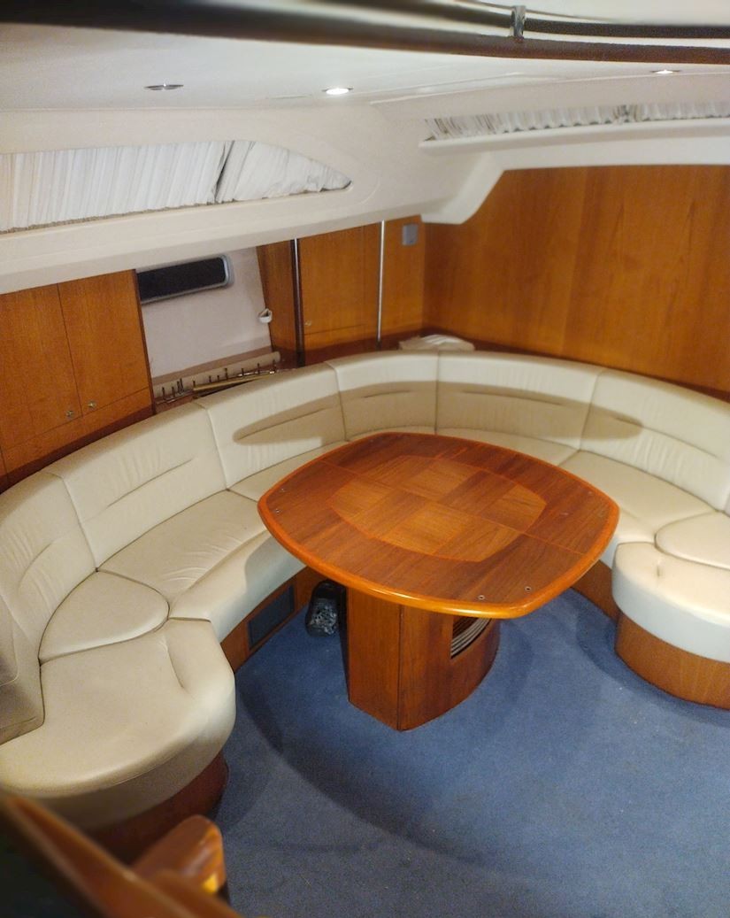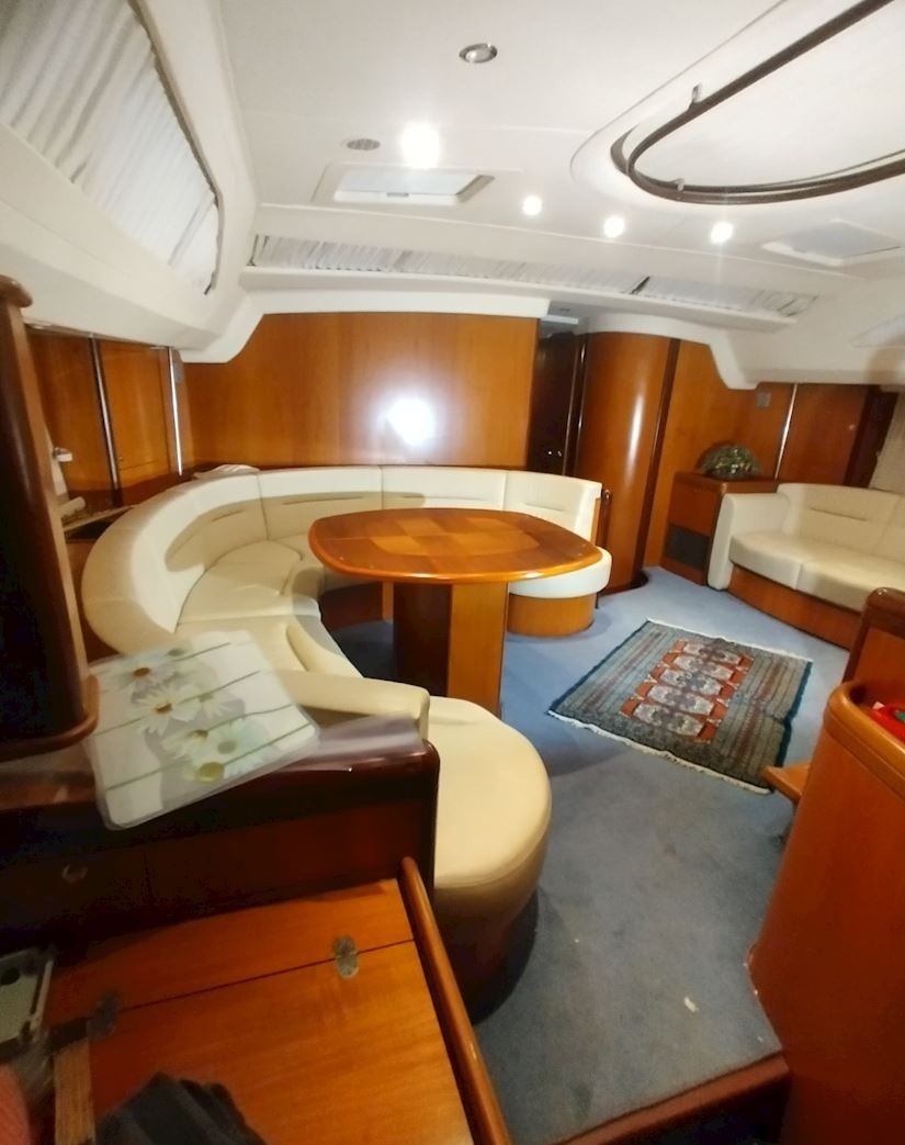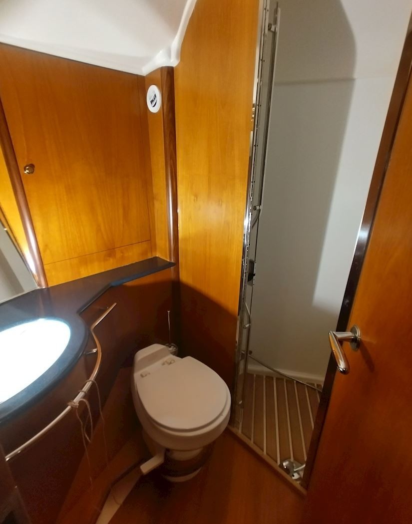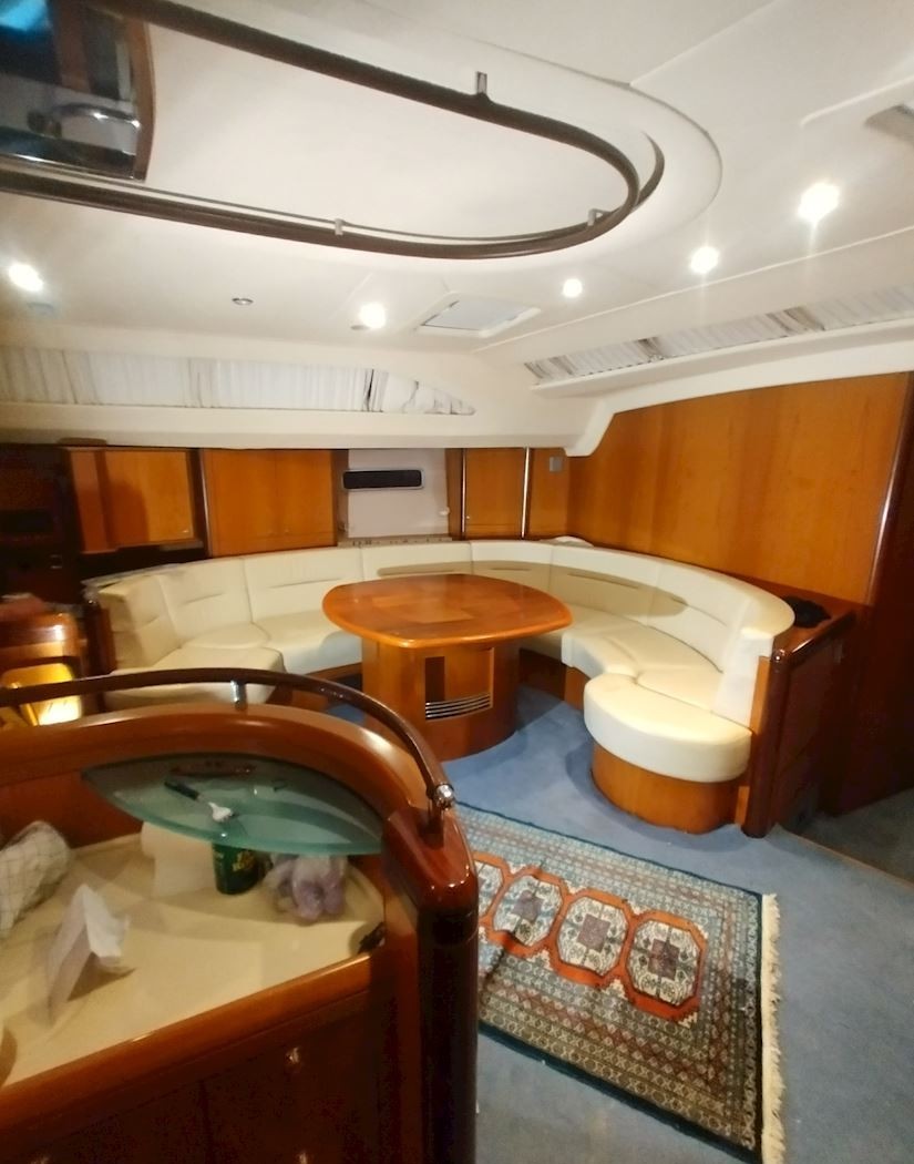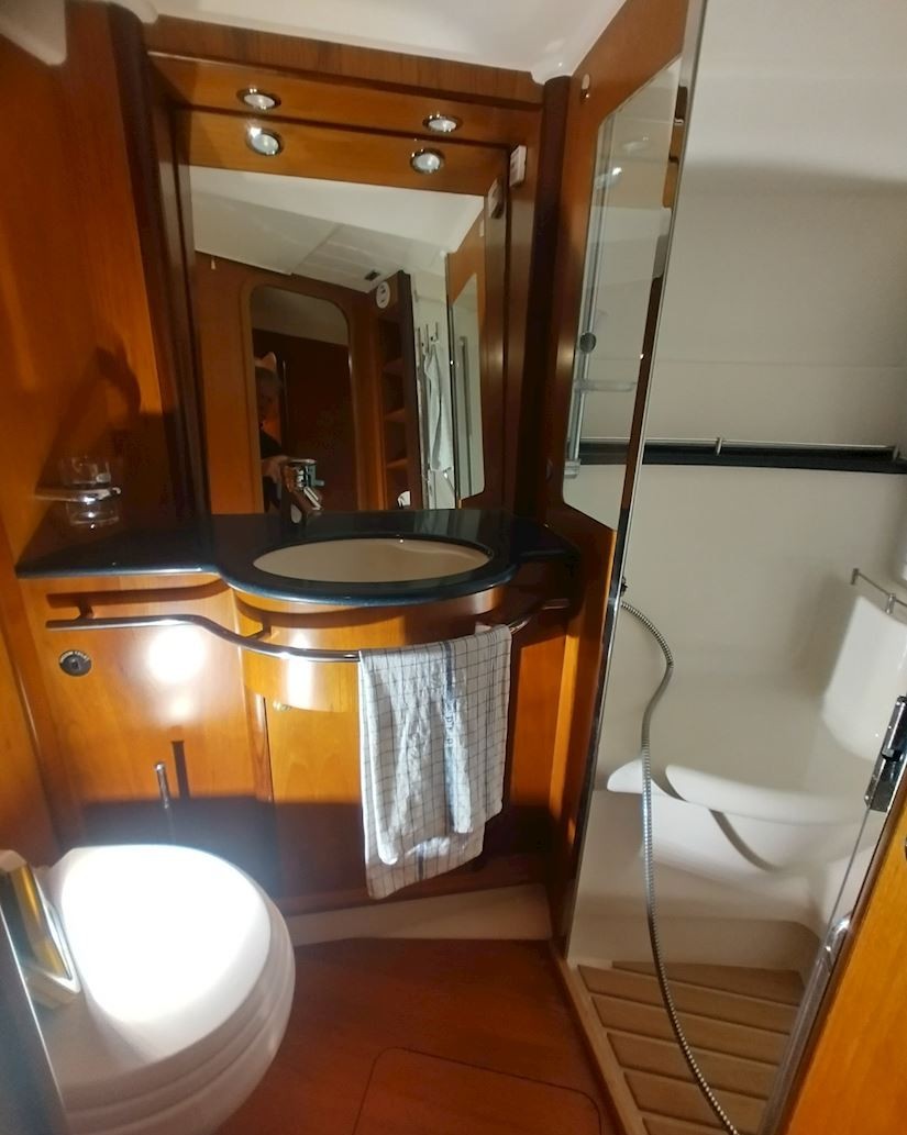 Interiören håller hög standard med fyra bekväma dubbelhytter samt en separat kaptenskoja. Ombord finns tre badrum med dusch och toalett samt ett fullt utrustat kök med spis och ugn, mikro, frys, två kylskåp, diskmaskin och tvättmaskin. Komforten ombord förstärks av centralvärme, varmvatten, luftkonditionering och generator, vilket gör båten idealisk för längre vistelser och segling i varierande klimat. Finns även ett nästan nytt sittbrunskapell.