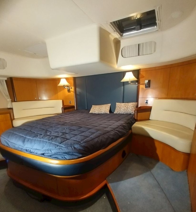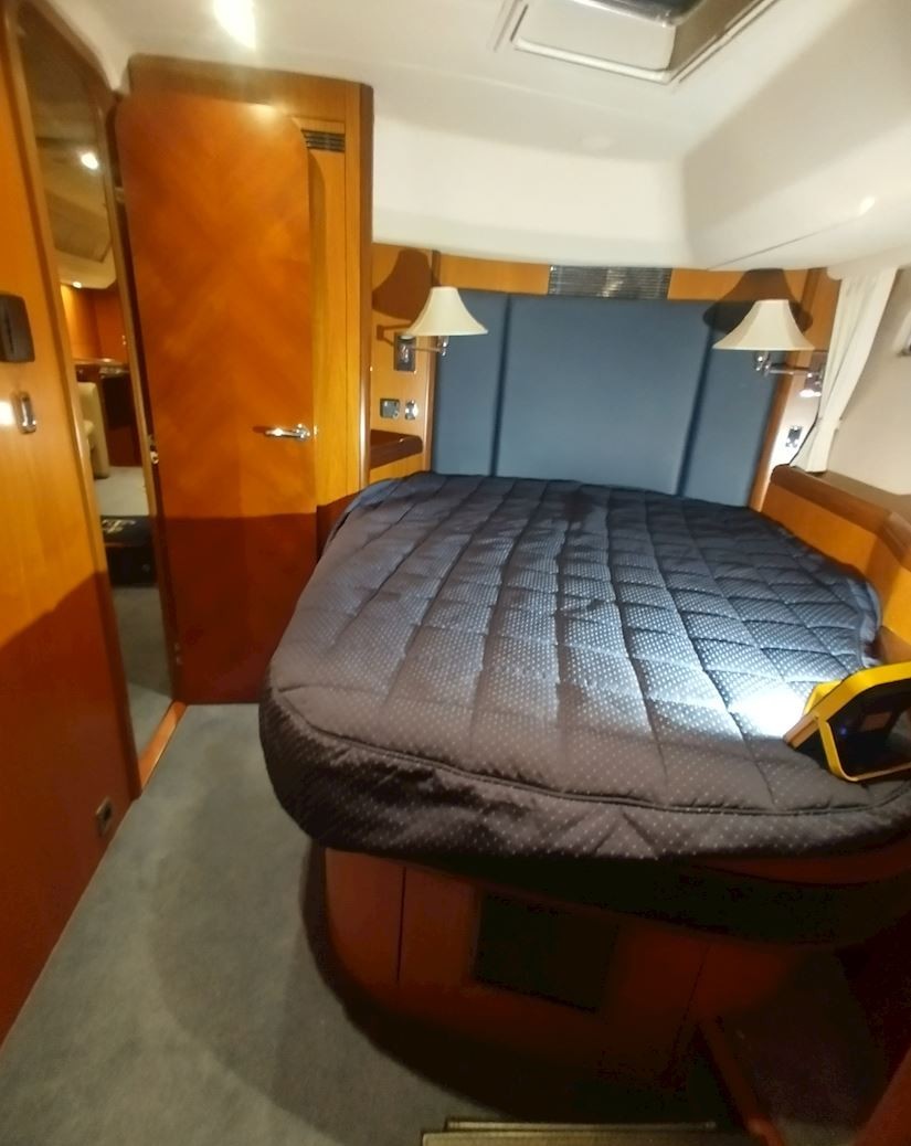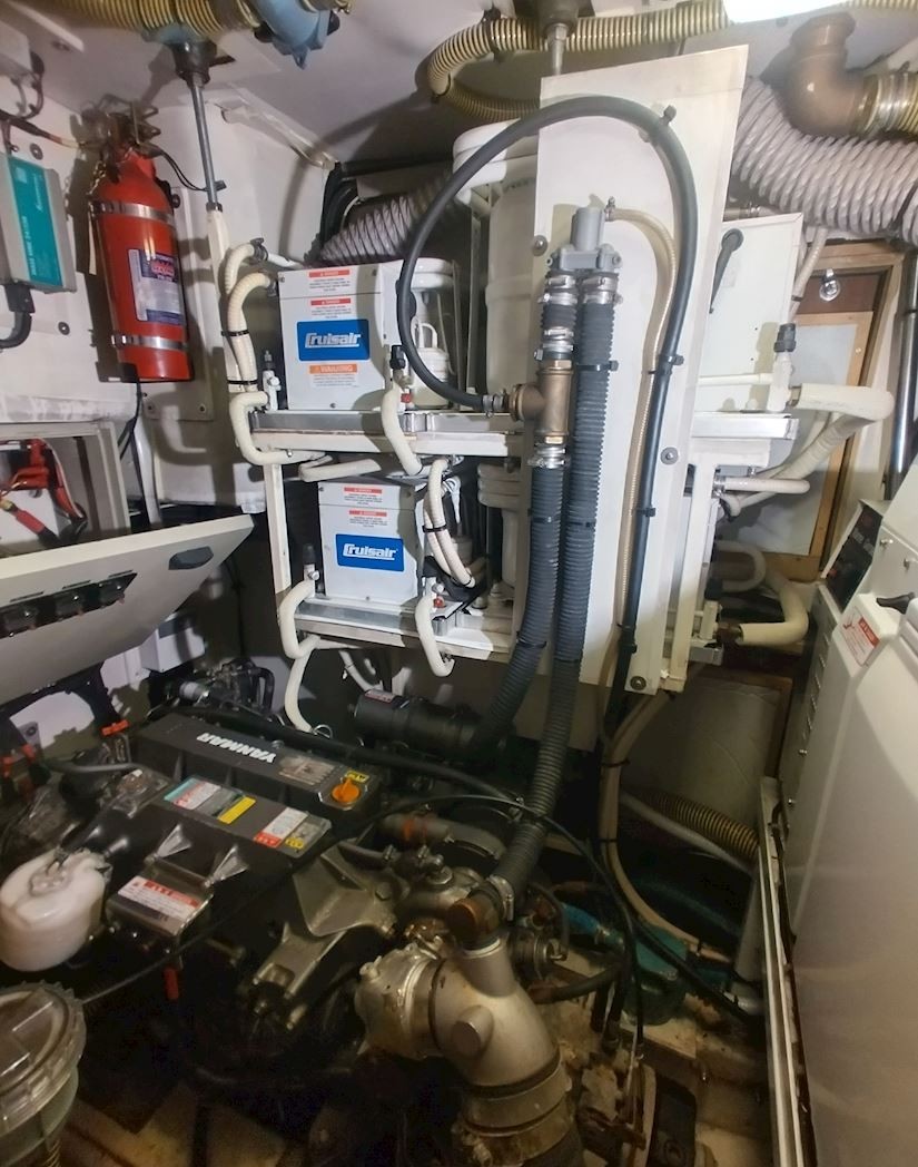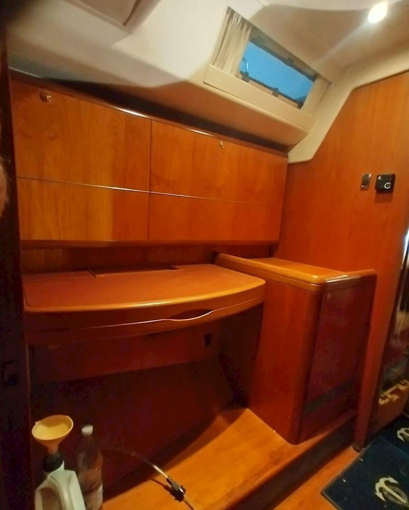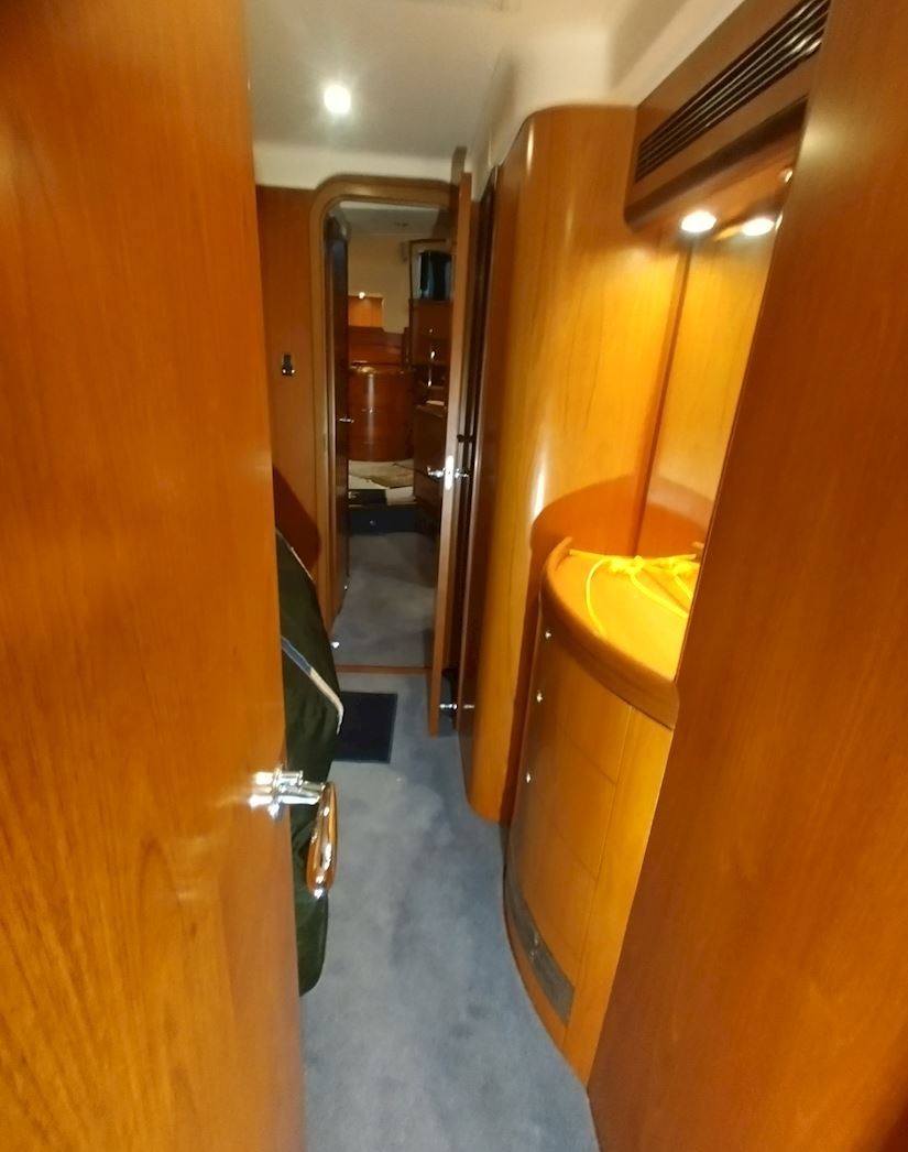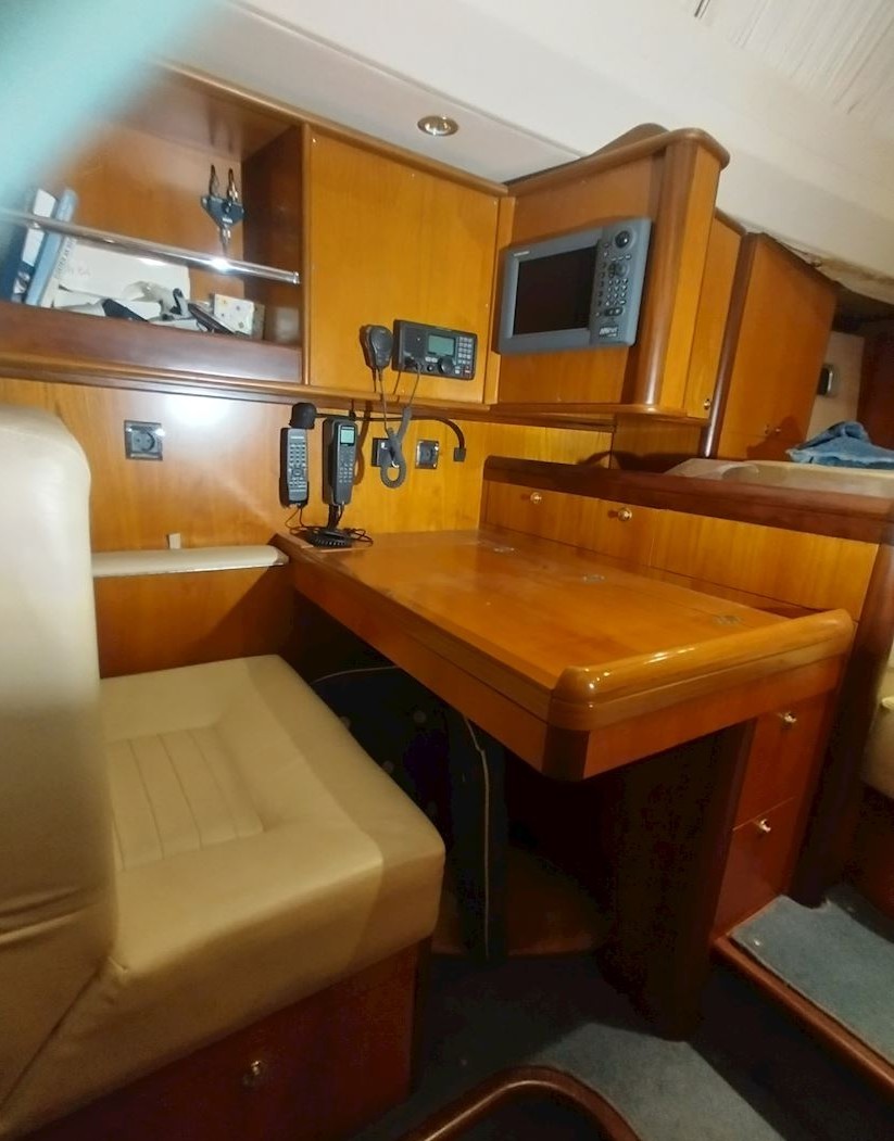 Interiören håller hög standard med fyra bekväma dubbelhytter samt en separat kaptenskoja. Ombord finns tre badrum med dusch och toalett samt ett fullt utrustat kök med spis och ugn, mikro, frys, två kylskåp, diskmaskin och tvättmaskin. Komforten ombord förstärks av centralvärme, varmvatten, luftkonditionering och generator, vilket gör båten idealisk för längre vistelser och segling i varierande klimat. Finns även ett nästan nytt sittbrunskapell.