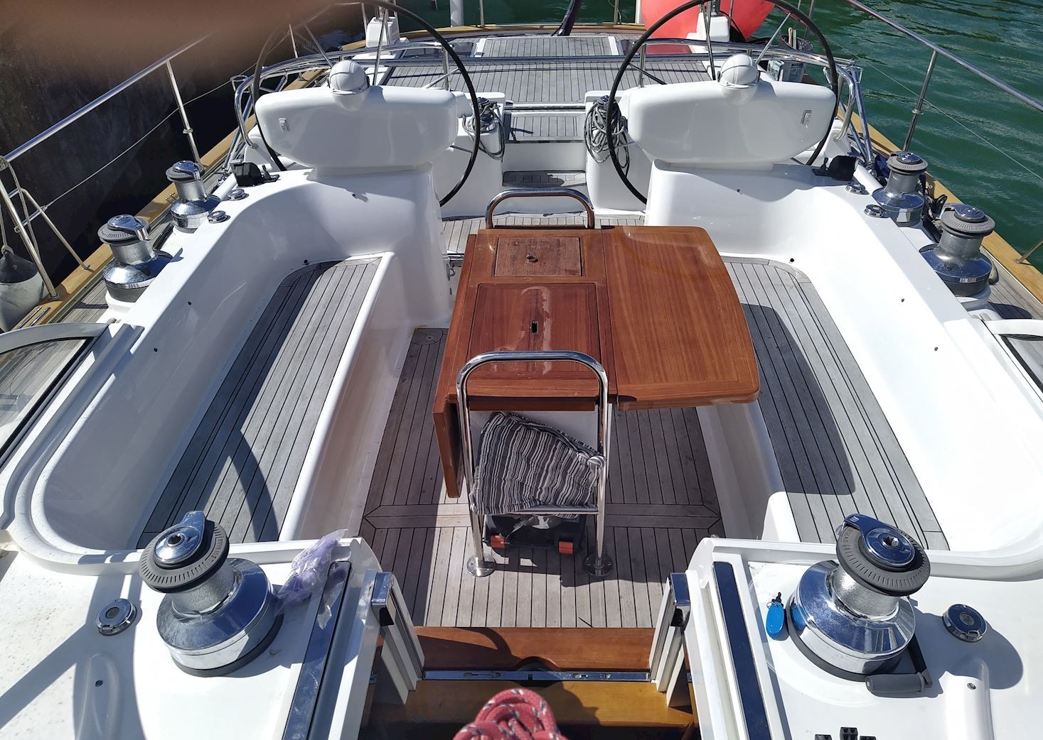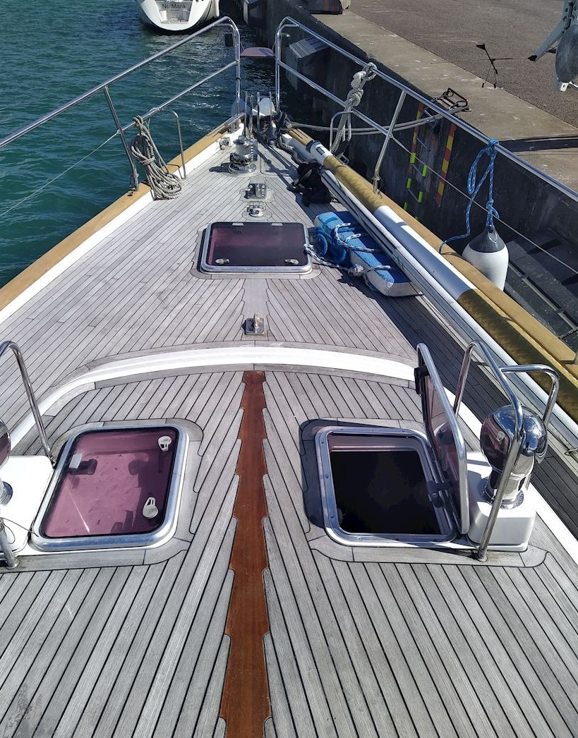 På däck erbjuds generösa ytor och hög komfort med teakdäck, teak i cockpit, cockpitbord, bimini, sittbrunnskapell, cockpitöverdrag, cockpitstält, badplattform och badstege. Rattstyrning ger god kontroll och en behaglig körställning.